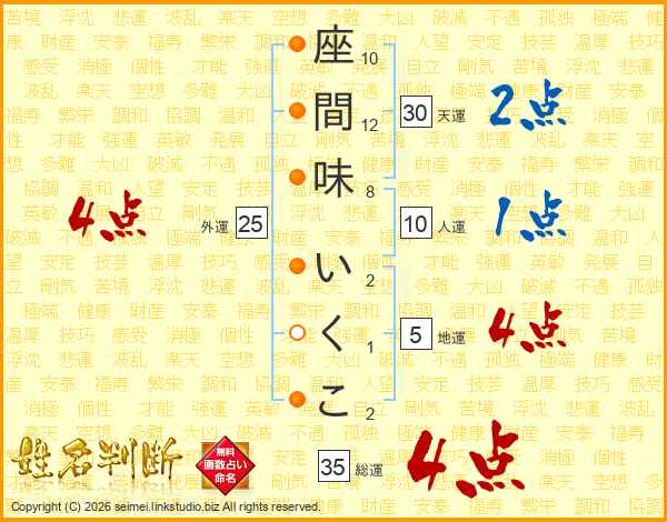 座(10画)間(12画)味(8画) い(2画)く(1画)こ(2画)