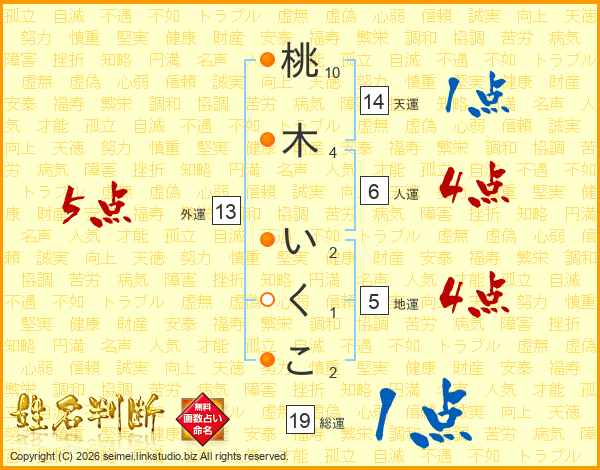 桃(10画)木(4画) い(2画)く(1画)こ(2画)