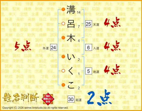 生活面を象徴する運勢です。外部から受ける影響力を表し、結婚運、家庭運や職場、環境への順応性を表します。総運から人運を引いた画数。姓や名が1文字の場合を除く。