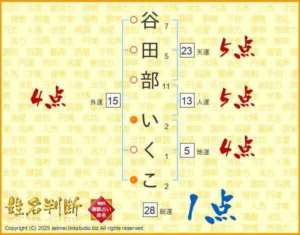 生活面を象徴する運勢です。外部から受ける影響力を表し、結婚運、家庭運や職場、環境への順応性を表します。総運から人運を引いた画数。姓や名が1文字の場合を除く。