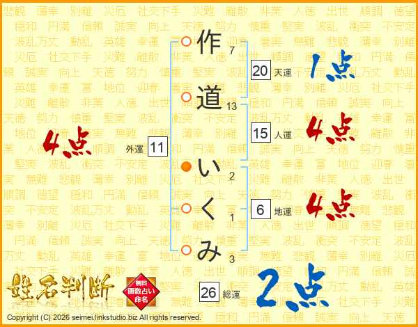 生活面を象徴する運勢です。外部から受ける影響力を表し、結婚運、家庭運や職場、環境への順応性を表します。総運から人運を引いた画数。姓や名が1文字の場合を除く。