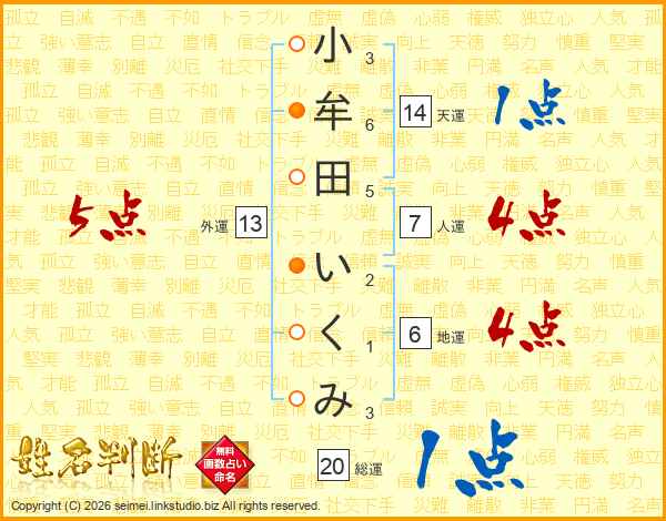 生活面を象徴する運勢です。外部から受ける影響力を表し、結婚運、家庭運や職場、環境への順応性を表します。総運から人運を引いた画数。姓や名が1文字の場合を除く。