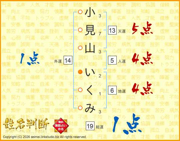 生活面を象徴する運勢です。外部から受ける影響力を表し、結婚運、家庭運や職場、環境への順応性を表します。総運から人運を引いた画数。姓や名が1文字の場合を除く。
