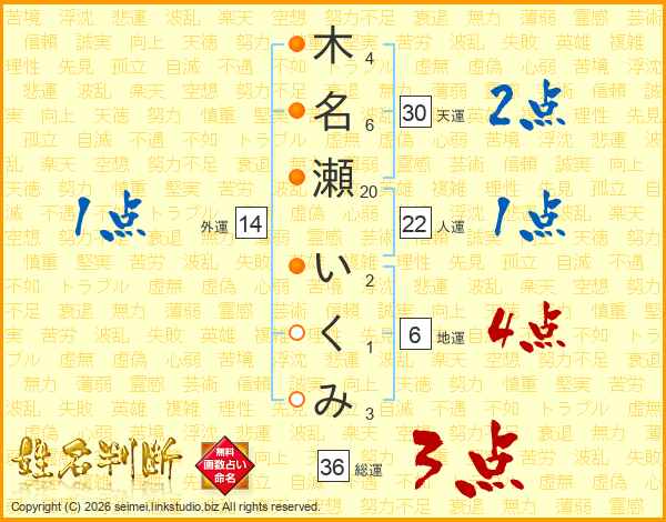 木(4画)名(6画)瀬(20画) い(2画)く(1画)み(3画)