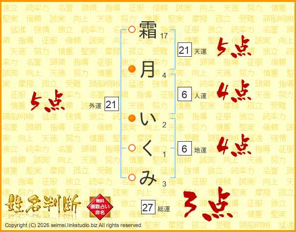 霜(17画)月(4画) い(2画)く(1画)み(3画)