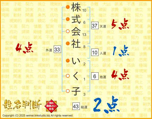 株式会社いく子さんの総運は43画の2点!