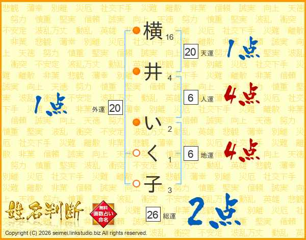 生活面を象徴する運勢です。外部から受ける影響力を表し、結婚運、家庭運や職場、環境への順応性を表します。総運から人運を引いた画数。姓や名が1文字の場合を除く。
