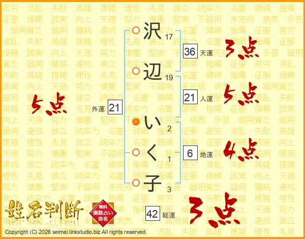 沢(17画)辺(19画) い(2画)く(1画)子(3画)