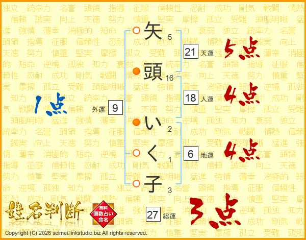 矢(5画)頭(16画) い(2画)く(1画)子(3画)