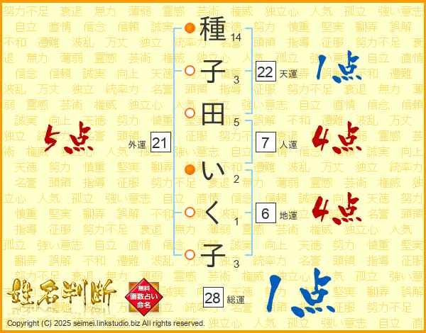 種(14画)子(3画)田(5画) い(2画)く(1画)子(3画)