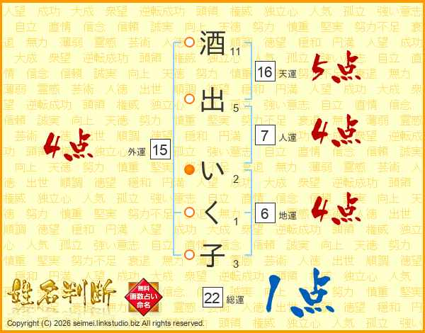 酒(11画)出(5画) い(2画)く(1画)子(3画)
