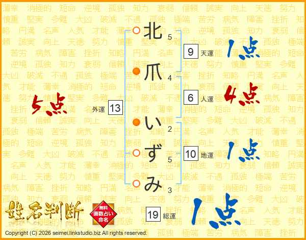 北(5画)爪(4画) い(2画)ず(5画)み(3画)