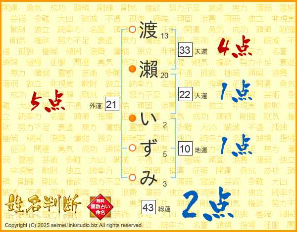 渡(13画)瀨(20画) い(2画)ず(5画)み(3画)