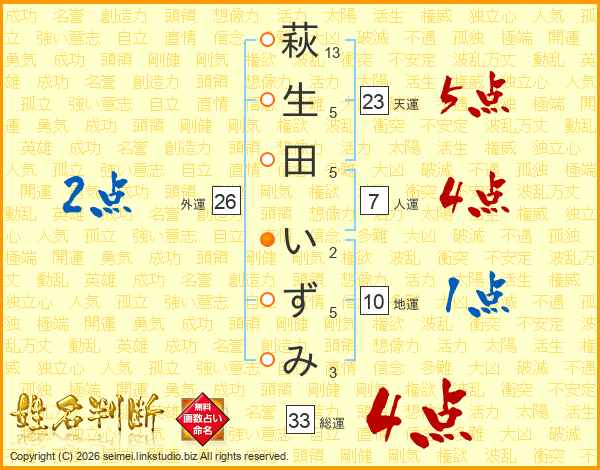 萩(13画)生(5画)田(5画) い(2画)ず(5画)み(3画)