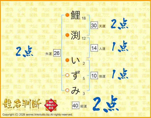 鯉(18画)渕(12画) い(2画)ず(5画)み(3画)