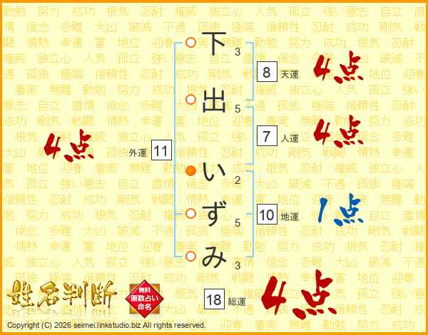 生活面を象徴する運勢です。外部から受ける影響力を表し、結婚運、家庭運や職場、環境への順応性を表します。総運から人運を引いた画数。姓や名が1文字の場合を除く。