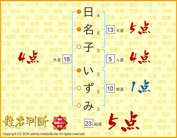 日名子いずみさんの総運は23画の5点!