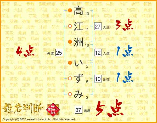 高(10画)江(7画)洲(10画) い(2画)ず(5画)み(3画)