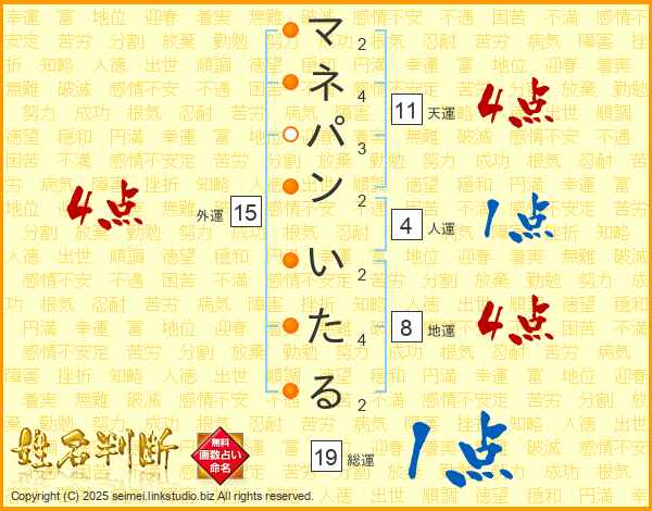 生活面を象徴する運勢です。外部から受ける影響力を表し、結婚運、家庭運や職場、環境への順応性を表します。総運から人運を引いた画数。姓や名が1文字の場合を除く。