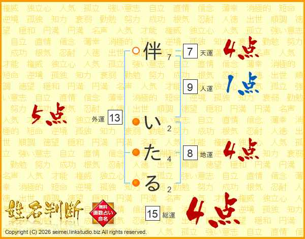 生活面を象徴する運勢です。外部から受ける影響力を表し、結婚運、家庭運や職場、環境への順応性を表します。総運から人運を引いた画数。姓や名が1文字の場合を除く。