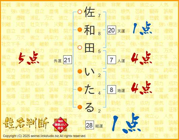 生活面を象徴する運勢です。外部から受ける影響力を表し、結婚運、家庭運や職場、環境への順応性を表します。総運から人運を引いた画数。姓や名が1文字の場合を除く。