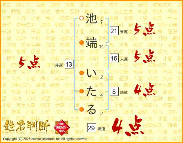 池端いたるさんの総運は29画の4点!