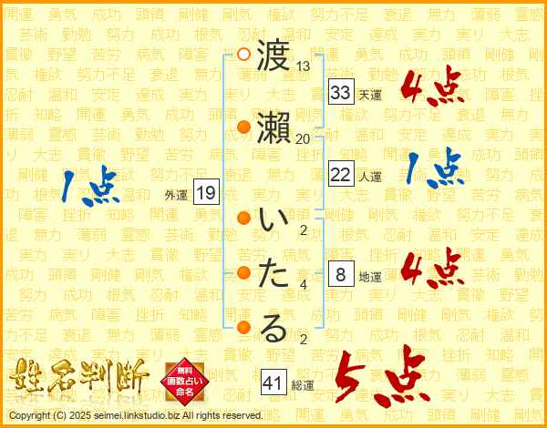 生活面を象徴する運勢です。外部から受ける影響力を表し、結婚運、家庭運や職場、環境への順応性を表します。総運から人運を引いた画数。姓や名が1文字の場合を除く。
