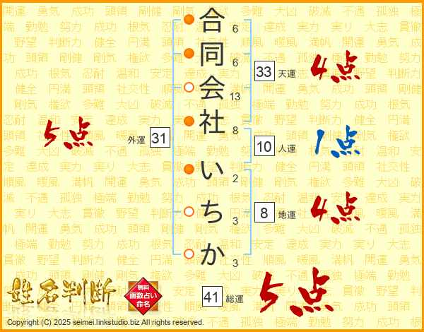 合(6画)同(6画)会(13画)社(8画) い(2画)ち(3画)か(3画)