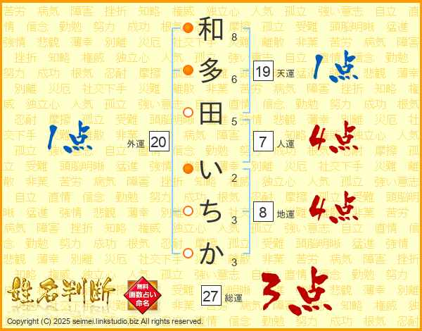 生活面を象徴する運勢です。外部から受ける影響力を表し、結婚運、家庭運や職場、環境への順応性を表します。総運から人運を引いた画数。姓や名が1文字の場合を除く。