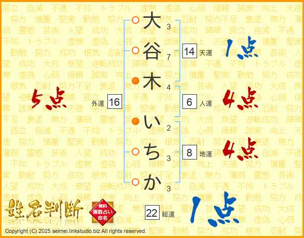 大(3画)谷(7画)木(4画) い(2画)ち(3画)か(3画)