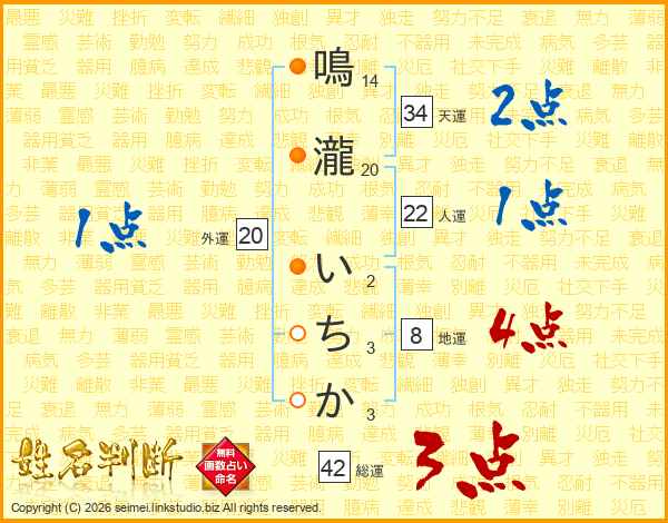 鳴(14画)瀧(20画) い(2画)ち(3画)か(3画)
