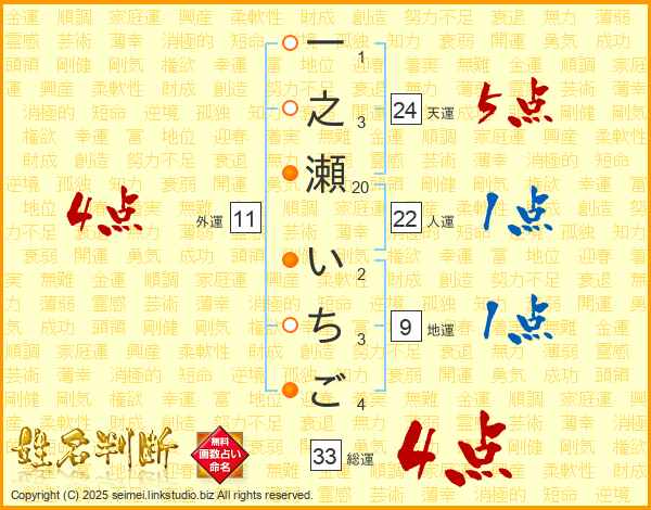 一(1画)之(3画)瀬(20画) い(2画)ち(3画)ご(4画)