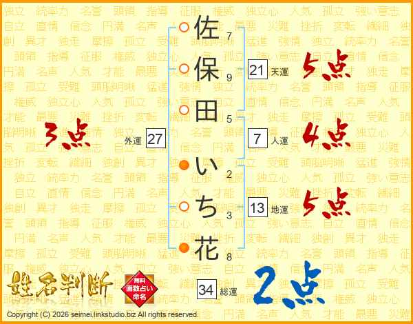 佐(7画)保(9画)田(5画) い(2画)ち(3画)花(8画)