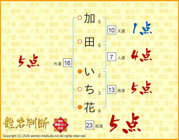 加田いち花さんの総運は23画の5点!