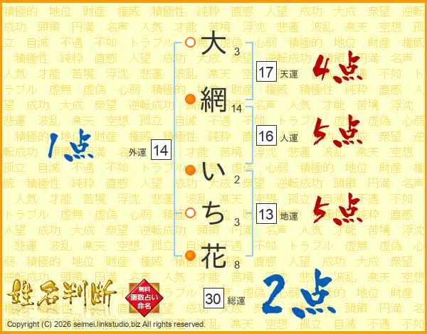 大(3画)網(14画) い(2画)ち(3画)花(8画)