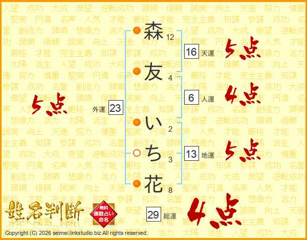 森(12画)友(4画) い(2画)ち(3画)花(8画)