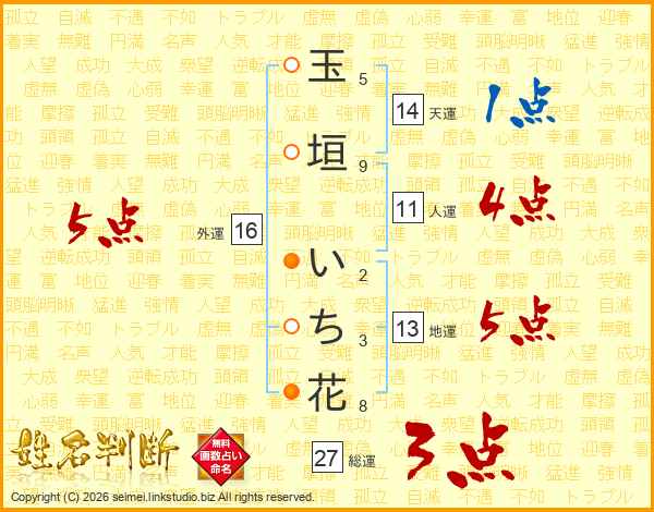 玉(5画)垣(9画) い(2画)ち(3画)花(8画)