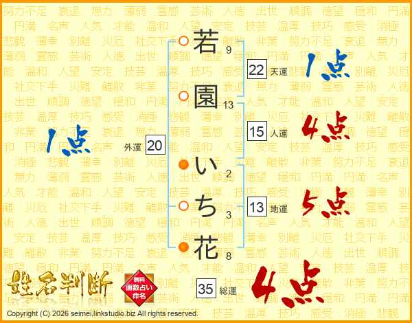 若(9画)園(13画) い(2画)ち(3画)花(8画)