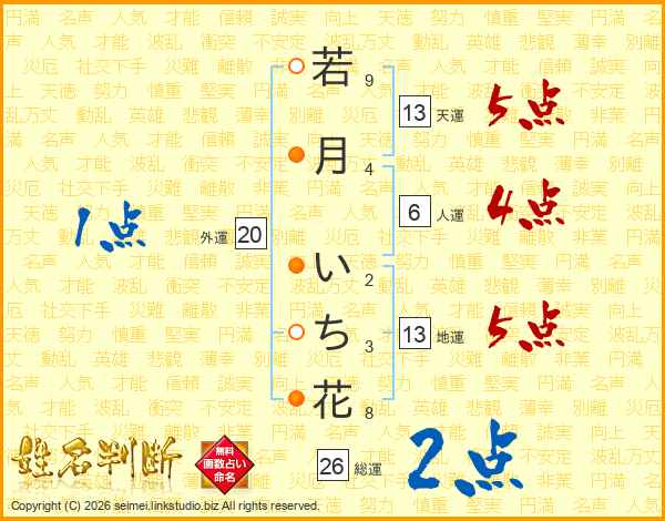 若(9画)月(4画) い(2画)ち(3画)花(8画)