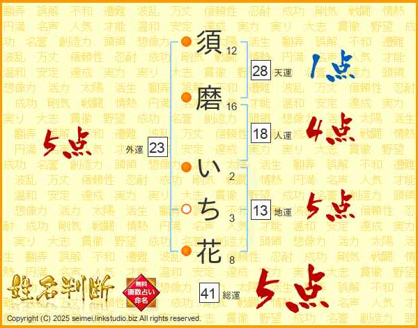 須(12画)磨(16画) い(2画)ち(3画)花(8画)