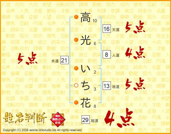 高(10画)光(6画) い(2画)ち(3画)花(8画)