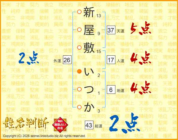 新(13画)屋(9画)敷(15画) い(2画)つ(1画)か(3画)