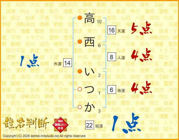高(10画)西(6画) い(2画)つ(1画)か(3画)