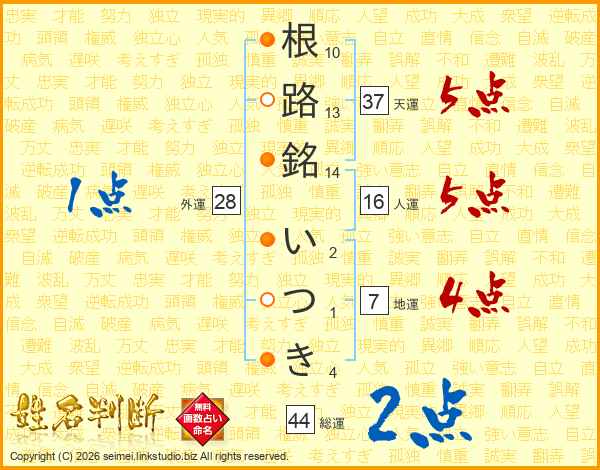 根(10画)路(13画)銘(14画) い(2画)つ(1画)き(4画)