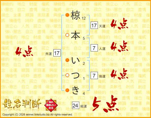 椋(12画)本(5画) い(2画)つ(1画)き(4画)