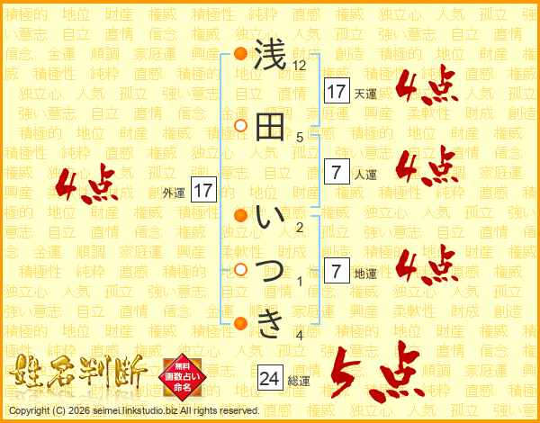 浅(12画)田(5画) い(2画)つ(1画)き(4画)