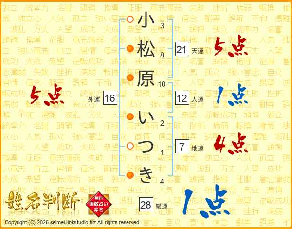 小(3画)松(8画)原(10画) い(2画)つ(1画)き(4画)