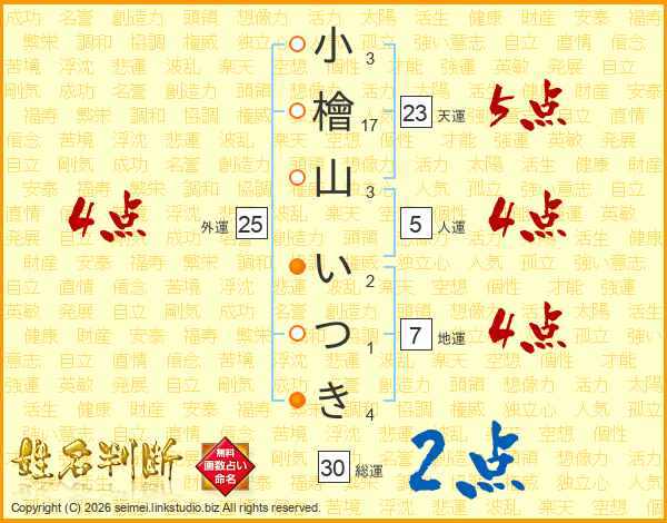 小(3画)檜(17画)山(3画) い(2画)つ(1画)き(4画)