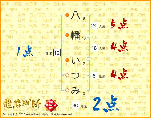 八(8画)幡(16画) い(2画)つ(1画)み(3画)