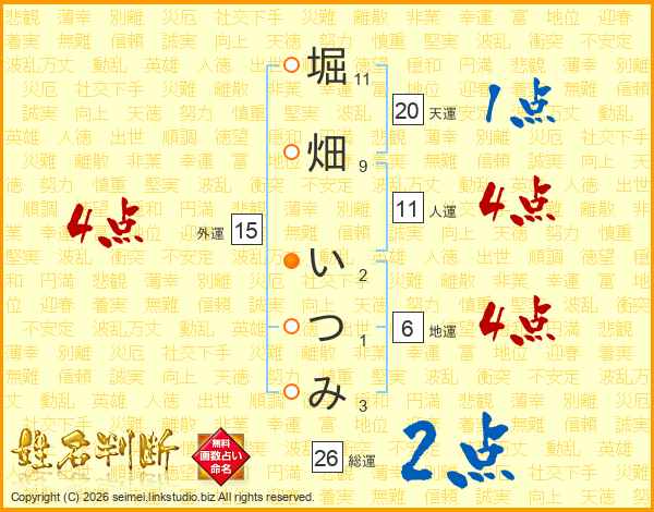 堀(11画)畑(9画) い(2画)つ(1画)み(3画)